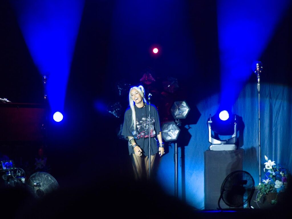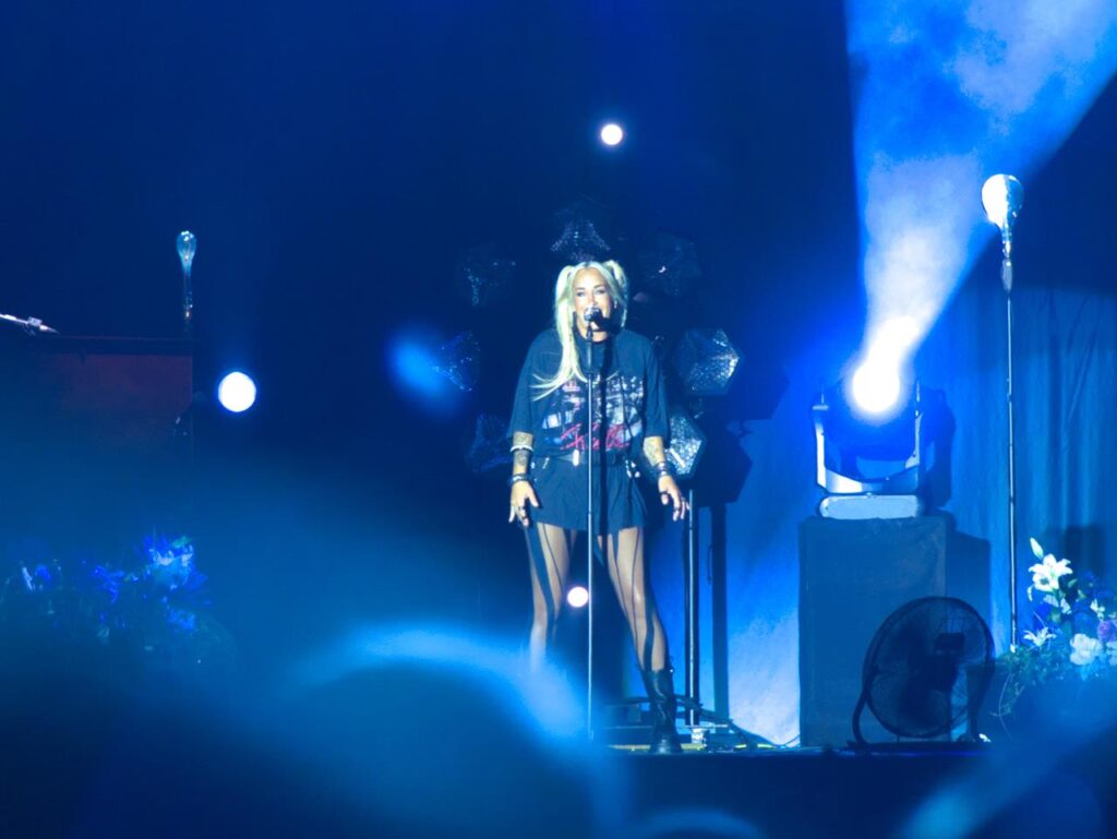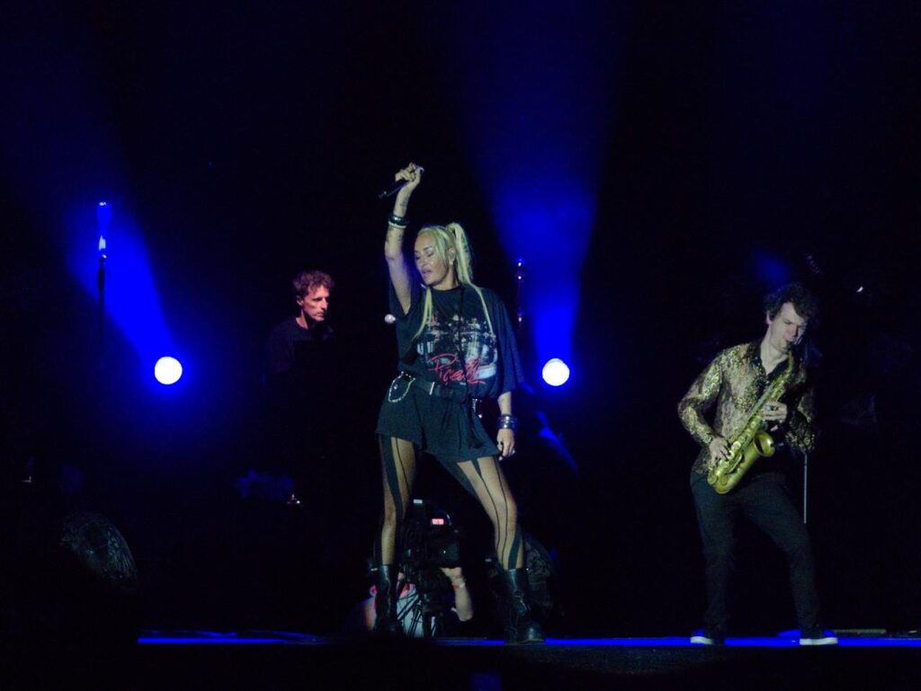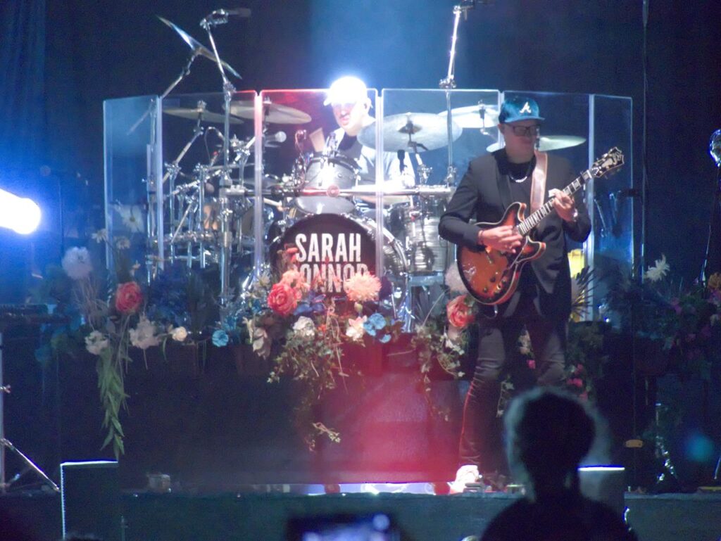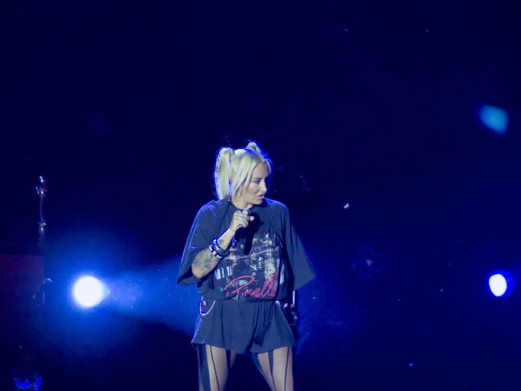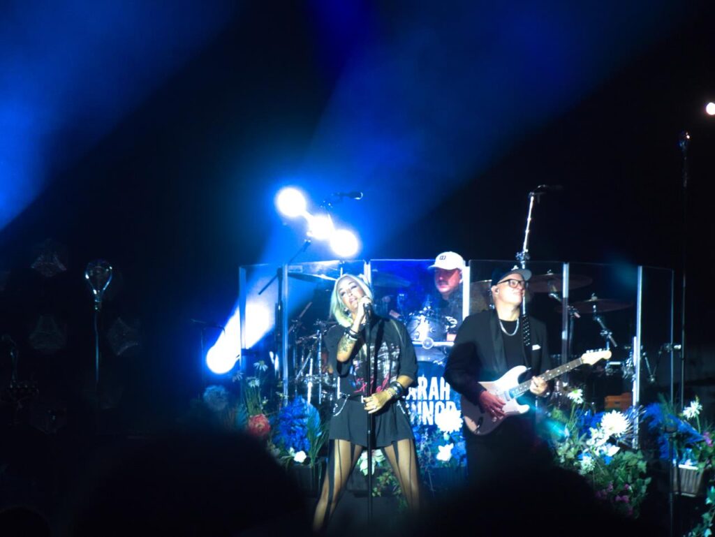 Das Tageslicht verschwand und in der Abenddämmerung begann gegen 21 Uhr das Konzert der stolzen Mutter Sarah, welches sie mit dem Song „Heut‘ ist alles gut“ aus ihrem aktuellen Album „Freigeistin“ eröffnete. Ein buntes Gemisch aus verschiedenen Werken zeichnete das Konzert aus. Sowohl Songs aus ihrem aktuellen Werk und Klassiker aus den Werken „Muttersprache“ und „Herz Kraft Werke“ mit den Songs „Bye Bye“ aus der Corona-Zeit aber auch Songs wie „Bounce“, mittlerweile über 20 Jahre alt.