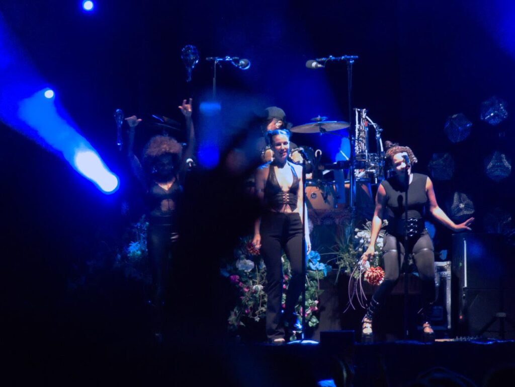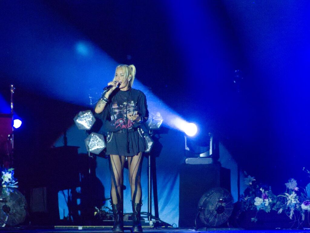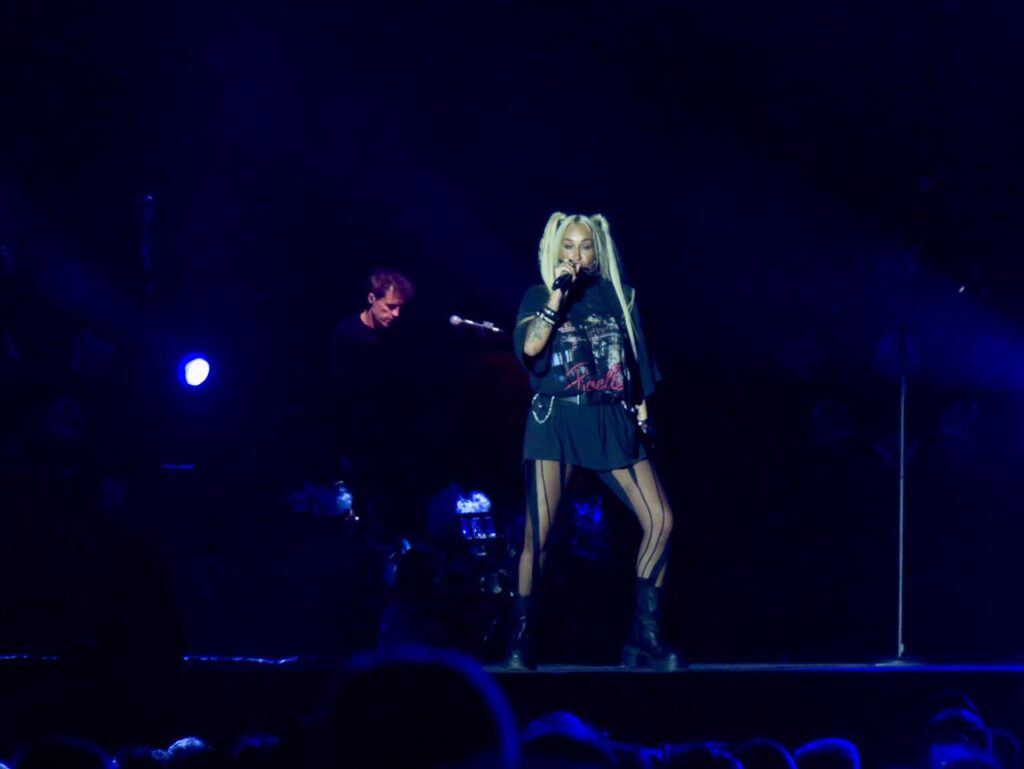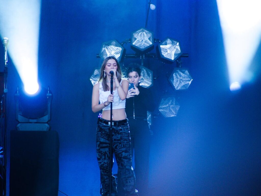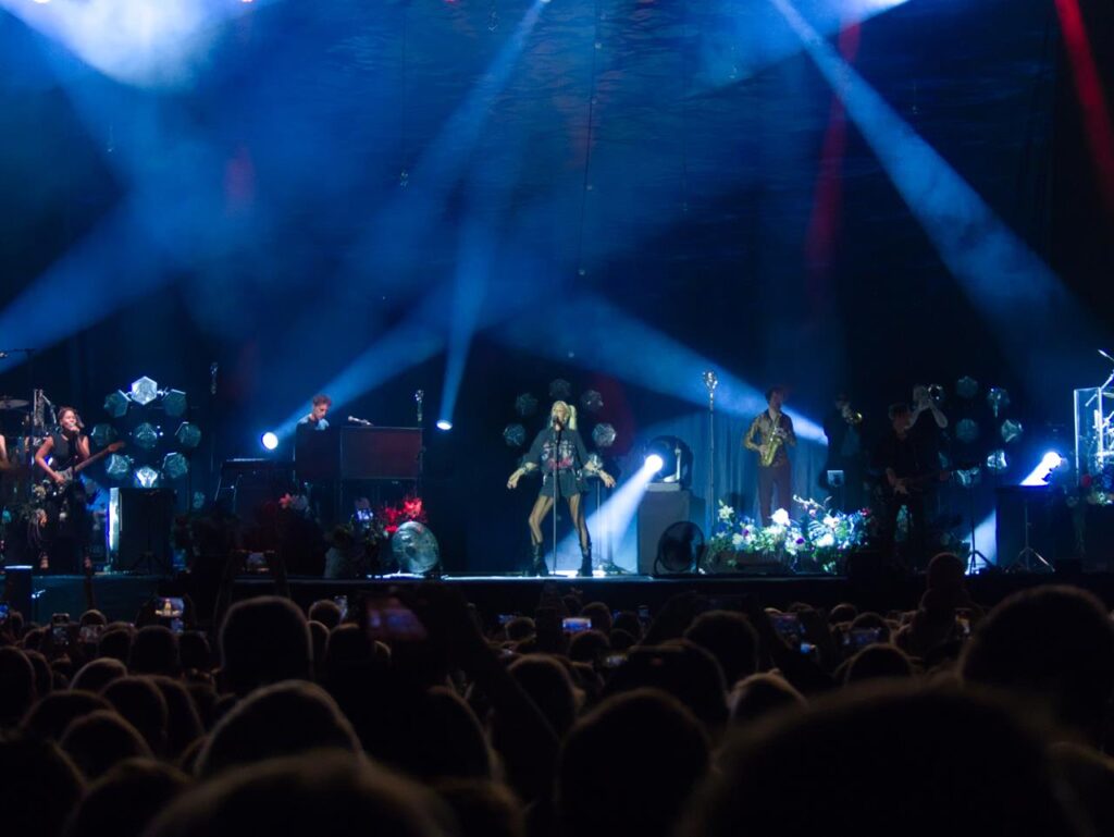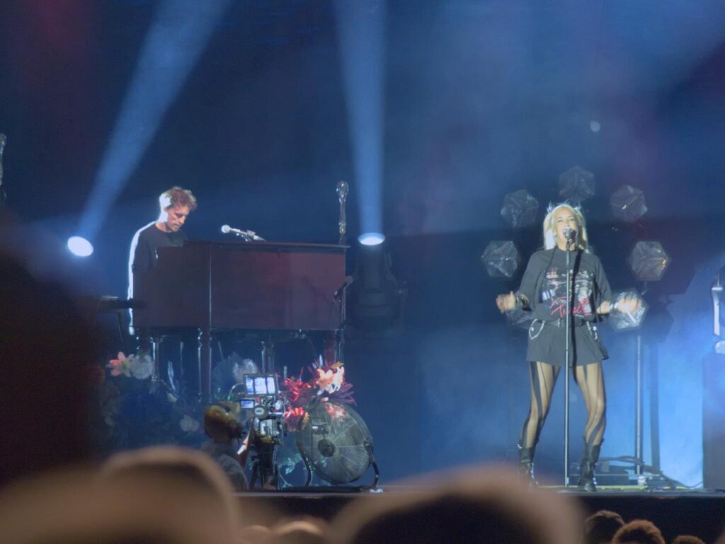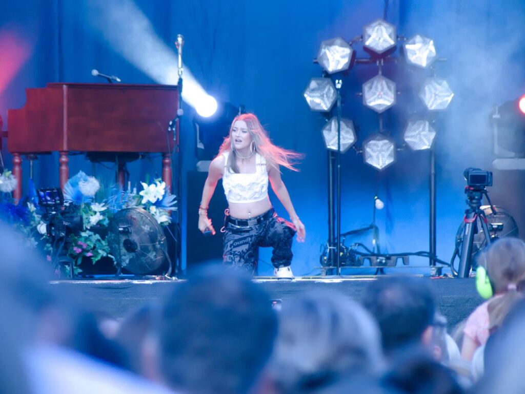 Das Tageslicht verschwand und in der Abenddämmerung begann gegen 21 Uhr das Konzert der stolzen Mutter Sarah, welches sie mit dem Song „Heut‘ ist alles gut“ aus ihrem aktuellen Album „Freigeistin“ eröffnete. Ein buntes Gemisch aus verschiedenen Werken zeichnete das Konzert aus. Sowohl Songs aus ihrem aktuellen Werk und Klassiker aus den Werken „Muttersprache“ und „Herz Kraft Werke“ mit den Songs „Bye Bye“ aus der Corona-Zeit aber auch Songs wie „Bounce“, mittlerweile über 20 Jahre alt.